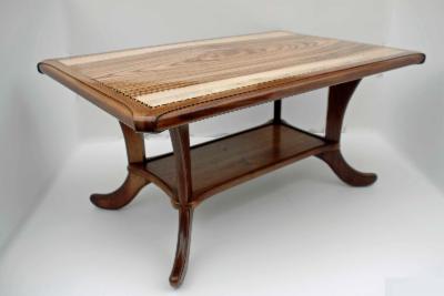 | Zebrano and walnut magazine table. Elegance and design originality of this magazine table are undeniable . The top is made out of solid piece of zebrano . The rest is black walnut . Even being not really big and looking sleek it is still quite heavy . Some hand carving has been performed on black walnut to deliver shapes and lines required for the design . The top is French polished by hand to high gloss finish. The rest is finished with shellac to high gloss finish W 22in (57cm) , L 34in (86 cm) , H 16 ½ in (42cm). | |