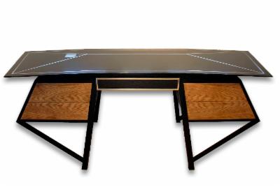 | Oak writing desk. The worktop is inlaid with aluminum strips it is 6ft (185 cm) wide and 2ft 31/2 in (70cm) deep.Scanner-printer is fitted in left hand side drawer. Middle drawer is 19 1/2in (48cm) by 14 1/2in (37cm) and 2in (5cm) deep. Two drawers on left hand side are 12 1/2in (32cm) by 15 in (38cm), 4in (10cm) deep and 16 1/2 in (42cm) by 15 in (38cm), 3 1/2 in (9cm) deep. Drawers are fitted to push-to-open runners. | |